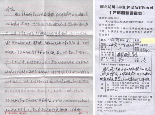老煙槍戒煙液,用事實說話近日隨州市康匯保健品有限公司又收到一封使用老煙槍戒煙液成功戒煙者感謝信。這只是多年來眾多來信的一封,今日將其中這封信公布出來,隨州康匯公司只想證明:老煙槍戒煙液,用事實說話!感謝熱心的葉先生。今